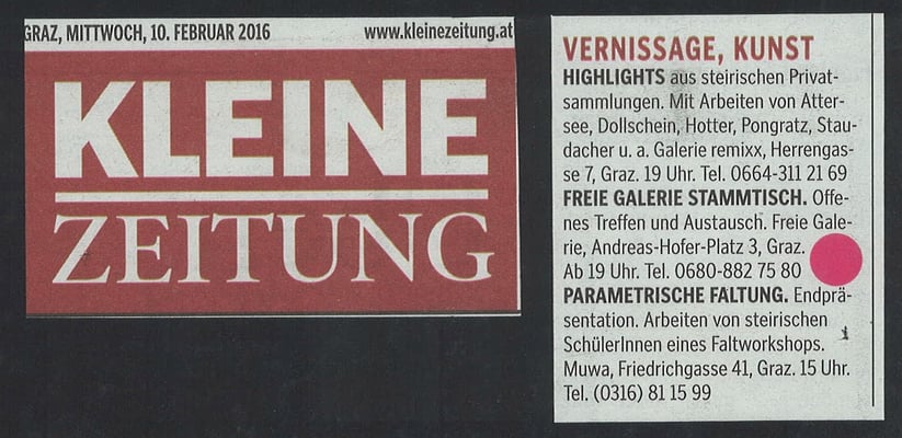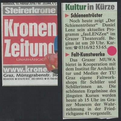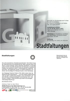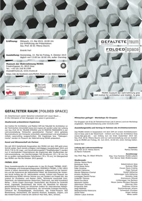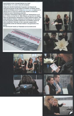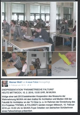 Infolge einer seit 2013 bestehenden Kooperation des Museums der Wahrnehmung MUWA mit dem Institut für Architektur und Medien IAM der Fakultät für Architektur an der TU Graz (https://iam.tugraz.at) wurden am 10. Februar 2016 um 15:00 Uhr im MUWA-Foyer Arbeiten von steirischen SchülerInnen eines Faltworkshops präsentiert.