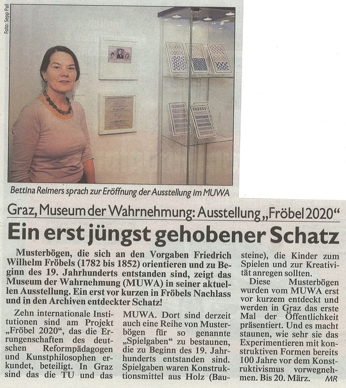 Die Ausstellung "FRÖBEL 2020" zeigt grafische Arbeiten aus dem Berliner Archiv, die bis dato wissenschaftlich unbearbeitet lagern und vor zwei Jahren wegen ihrer Brillanz, ihrer leuchtenden Farben, ihres systematisch anmutenden Variantenreichtums und zugleich ihrer betörenden Einfachheit die Aufmerksamkeit des MUWA erregt haben. Eine Auswahl von Musterbögen, die auf Friedrich Fröbels Vorschläge zurückgehen und um die Wende vom 19. zum 20. Jahrhundert entstanden sind, werden in sieben Vitrinen und zahlreichen Bildkästen in ihrer historisch bedeutsamen Präsentation gezeigt.