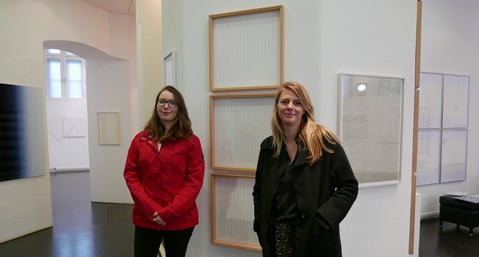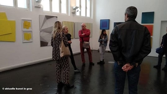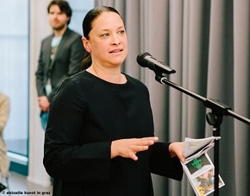 akig-Projektleiterin TANJA GASSLER bei der Eröffnung in der Camera Austria, Rundgangsleiterin ALEXANDRA GRAUSAM in der Ausstellung GOMRINGER! im MUWA