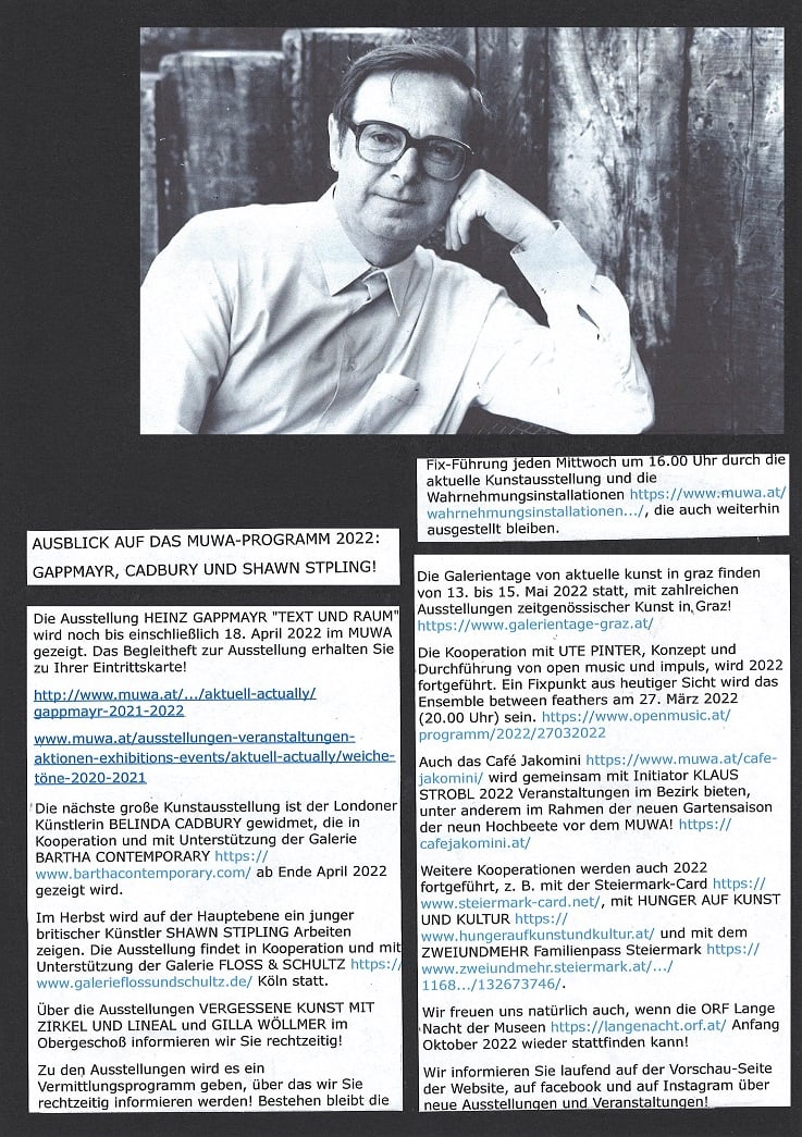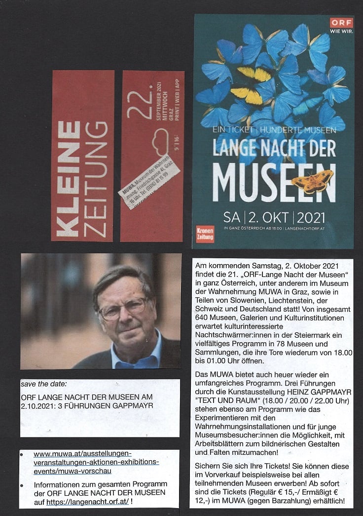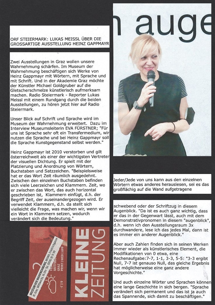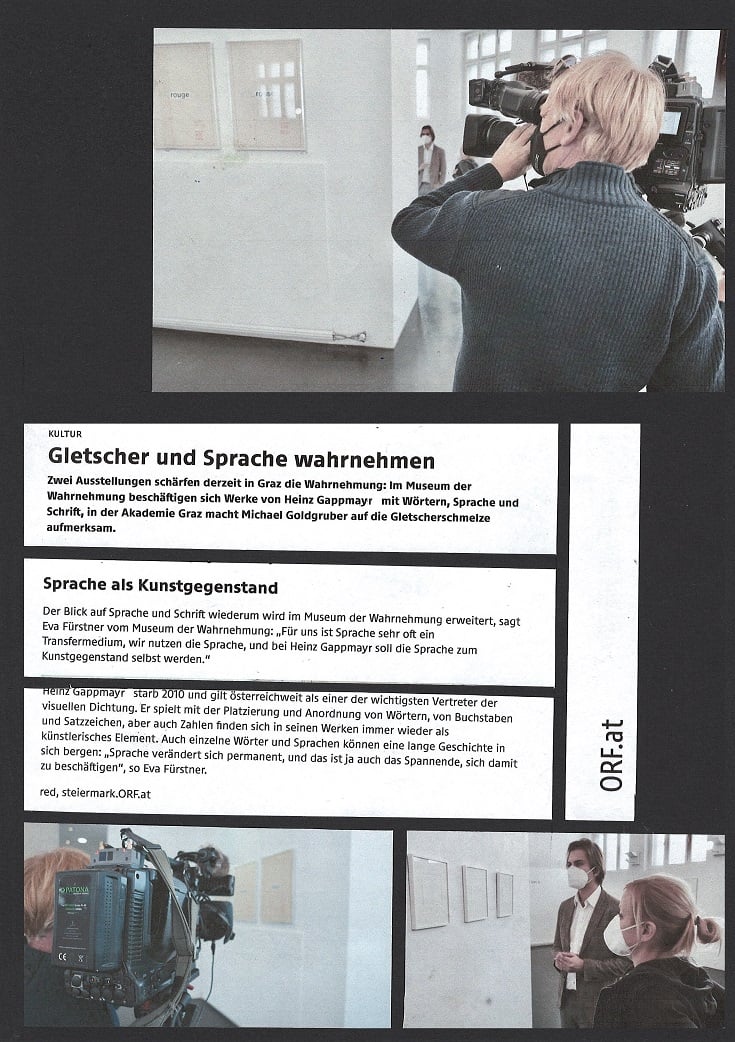 In ORF Steiermark Heute vom 1. Februar 2022 berichtet Kulturredakteur LUKAS MEISSL über die Ausstellung von HEINZ GAPPMAYR "TEXT UND RAUM" im Museum der Wahrnehmung, er hat mit MUWA-Leiterin EVA