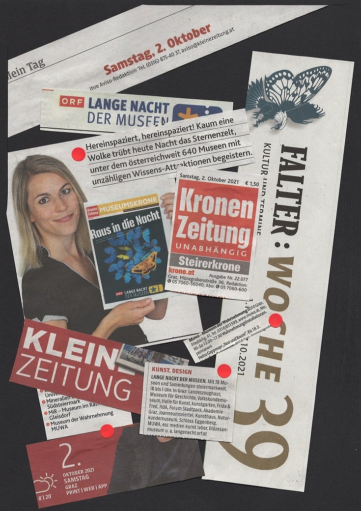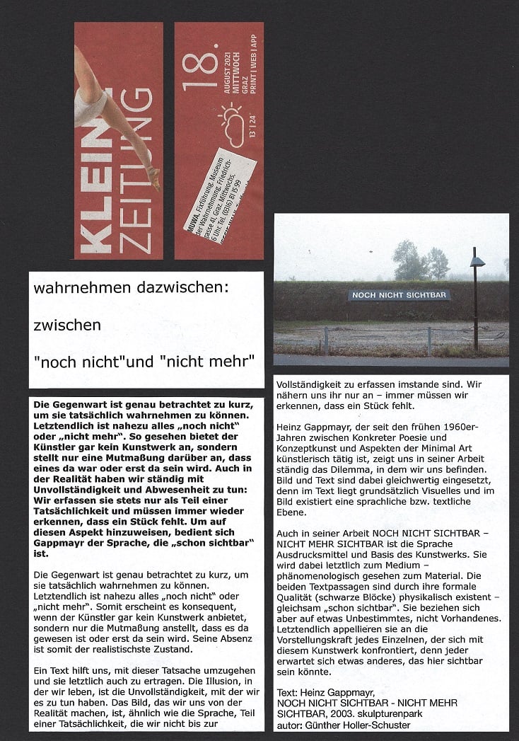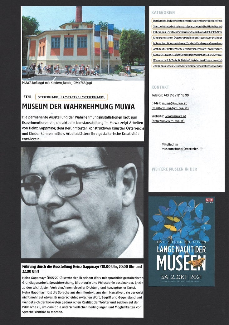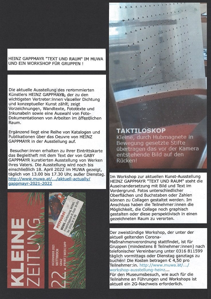 In ORF Steiermark Heute vom 1. Februar 2022 berichtet Kulturredakteur LUKAS MEISSL über die Ausstellung von HEINZ GAPPMAYR "TEXT UND RAUM" im Museum der Wahrnehmung, er hat mit MUWA-Leiterin EVA