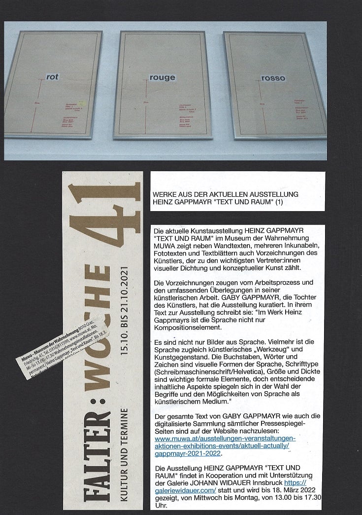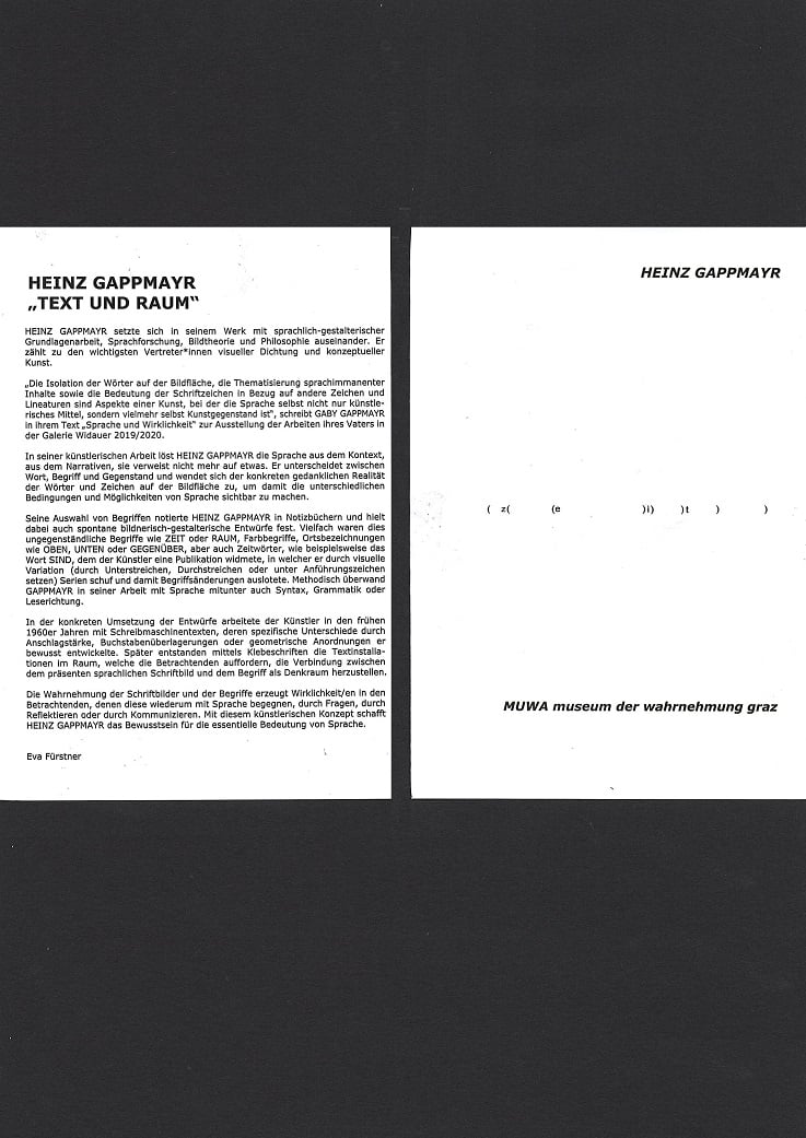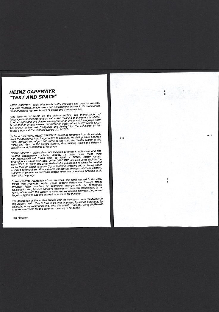 „Die Isolation der Wörter auf der Bildfläche, die Thematisierung sprachimmanenter Inhalte sowie die Bedeutung der Schriftzeichen in Bezug auf andere Zeichen und Lineaturen sind Aspekte einer Kunst, bei der die Sprache selbst nicht nur künstlerisches Mittel, sondern vielmehr selbst Kunstgegenstand ist“, schreibt GABY GAPPMAYR in ihrem Text „Sprache und Wirklichkeit“ zur Ausstellung der Arbeiten ihres Vaters in der Galerie Widauer 2019/2020.