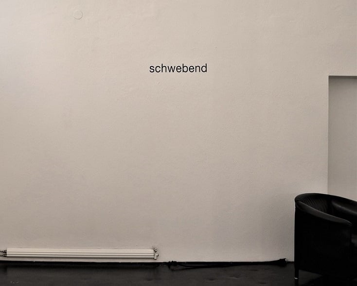 Eine andere Funktion hat das Wort schwebend (WVZ. 481/1982), das in der Mitte einer großen Wand steht. Der poetische Moment wird in der Verwendung des Partizip Präsens sichtbar. Es ist eine Form, die adjektivisch gebraucht einen Zustand beschreibt und zugleich aber als Verb einen aktiven Vorgang im Augenblick der Wahrnehmung impliziert. Das Wort hat hier indikatorischen Charakter, es bestimmt den Blick derer, die es wahrnehmen und rezipieren. Durch die Isolierung auf der Fläche, durch seine Vereinzelung im Raum, verändert es seine Umgebung. Normalerweise beziehen sich Verben oder Adjektive auf Subjekte, auf Nomen. Jemand macht etwas, jemand hat diese oder jene Eigenschaft. Thema dieses Werkes ist alleine die Schönheit des Zuständlichen. Durch die Sprache ist es möglich, das Begriffliche hinter den Wörtern zu veranschaulichen. schwebend bedeutet („schweben“ auf duden online. URL-https://www.duden.de/rechtschreibung/schweben /aufg.am 5.9,2021) sich in der Luft, im Wasser o.ä. im Gleichgewicht halten, ohne zu Boden zu sinken / sich schwebend irgendwohin bewegen / noch nicht abgeschlossen, im Gange sein. All diese Eigenschaften sind natürliche Eigenschaften des Begriffes. Sie treten in einen Dialog mit dem Umgebungsraum und transformieren ihn durch das rein Begriffliche.
