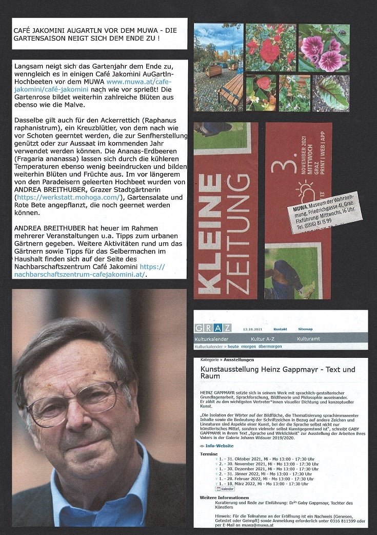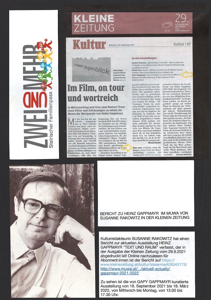 Einen umfangreicheren Bericht zur Ausstellung HEINZ GAPPMAYRs auf ORF Radio Steiermark von LUKAS MEISSL können Sie ebenfalls noch bis 7. Februar nachhören unter: https://radiothek.orf.at/stm/20220201/STTAG/1643737193000