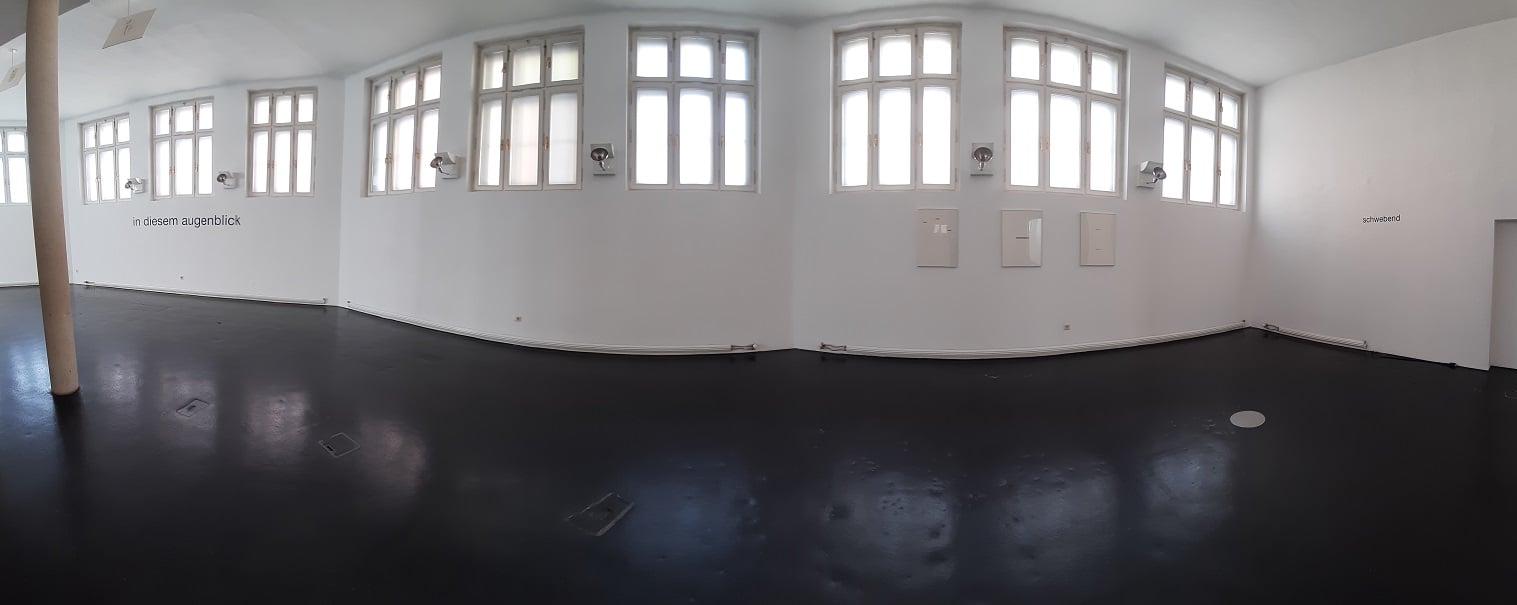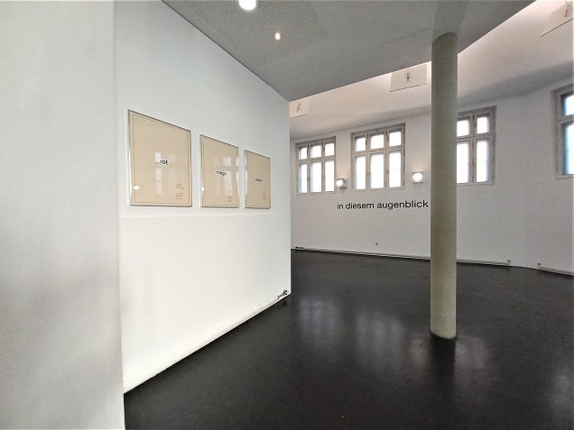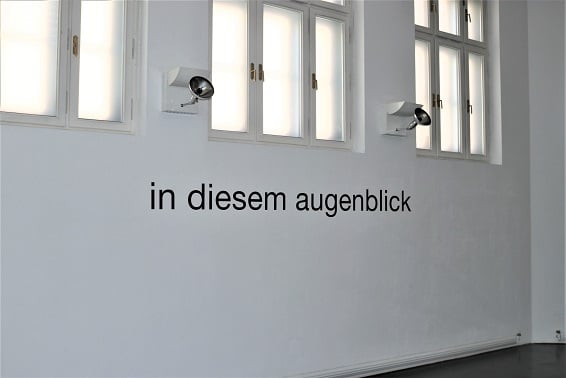 in diesem augenblick (WVZ. 1935/1997) – ein Wandtext, dem man begegnet, wenn man durch den Ausstellungsraum spaziert. Diese Zeitbestimmung veranschaulicht auf direkte, ja fast existenziell aufwühlende Weise die Bedeutung des Augenblicklichen. Grammatikalisch ist das Demonstrativpronomen ein wesentliches Element dieses Werkes. „Dieser“ Augenblick ist ein Jetzt, es ist der Zeitpunkt der Wahrnehmung des Begrifflichen. Das Denken und die Erfahrung des Gegenwärtigen, des Unmittelbaren sind hier ident. Das Demonstrativpronomen wird zum Auslöser jener Vorstellung einer Zeiterfahrung, die kaum möglich ist. Die Formulierung „in diesem augenblick“ ist eine Interaktion mit dem Gegenüber, ein Postulat, sich dem Begriff des Augenblicklichen zu stellen. Das Paradoxon besteht in der Differenz zwischen der permanenten visuellen Präsenz der Schrift und der transitorischen Qualität des Begrifflichen.