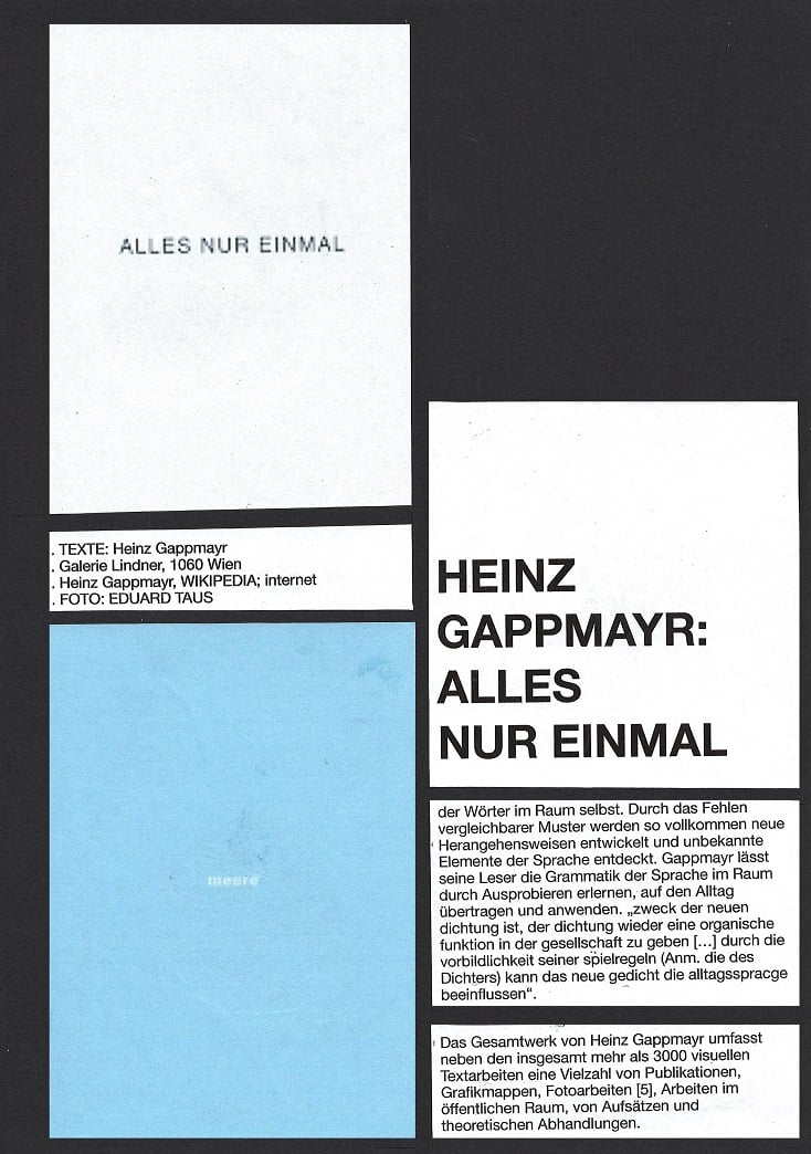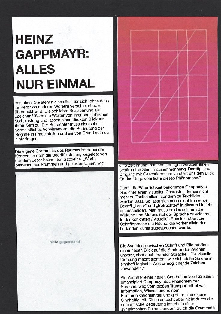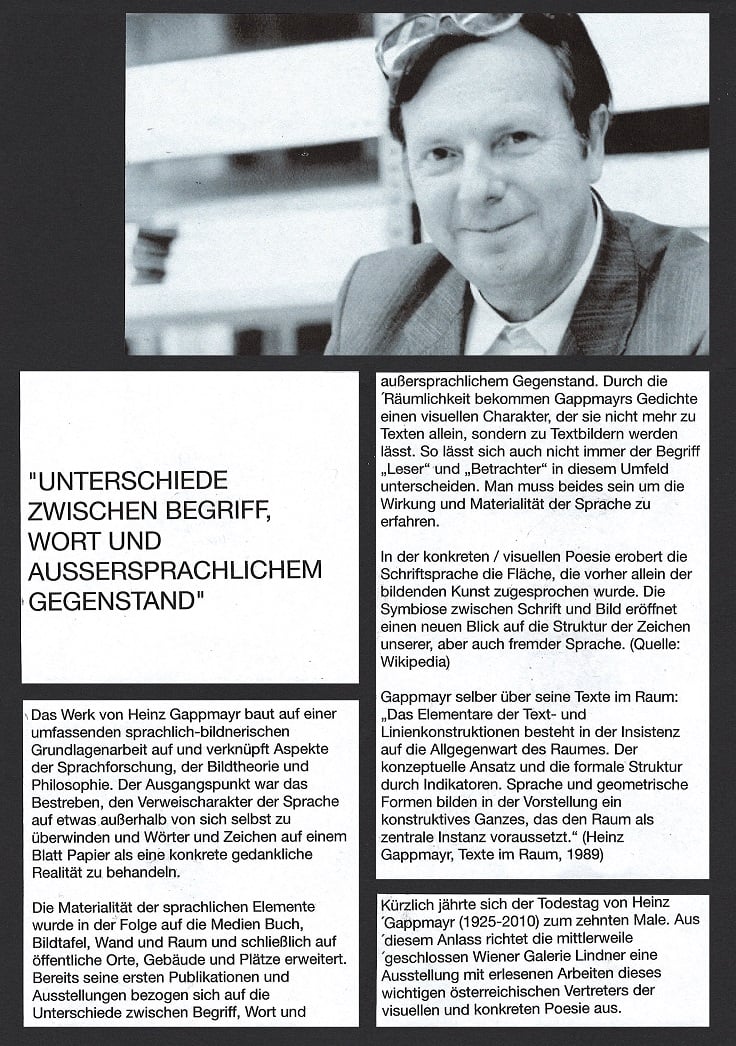soll die Sprache Kunstgegenstand selbst werden.' Heinz Gappmayr ist 2010 verstorben und gilt österreichweit als einer der wichtigsten Vertreter der visuellen Dichtung. Er spielt mit der