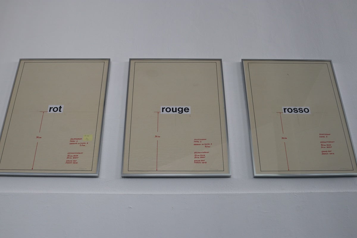 In the concrete realization of the sketches, the artist worked in the early 1960s with typewriter texts, whose specific differences through stroke strength, letter overlays or geometric arrangements he consciously developed. Later, he used adhesive lettering to create text installations in the room, which invite the viewer to make the connection between the present linguistic typeface and the concept as a space for thinking.