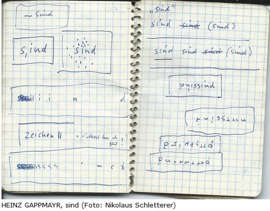 Seine Auswahl von Begriffen notierte HEINZ GAPPMAYR in Notizbüchern und hielt dabei auch spontane bildnerisch-gestalterische Entwürfe fest. Vielfach waren dies ungegenständliche Begriffe wie ZEIT oder RAUM, Farbbegriffe, Ortsbezeichnungen wie OBEN, UNTEN oder GEGENÜBER, aber auch Zeitwörter, wie beispielsweise das Wort SIND, dem der Künstler eine Publikation widmete, in welcher er durch visuelle Variation (durch Unterstreichen, Durchstreichen oder unter Anführungszeichen setzen) Serien schuf und damit Begriffsänderungen auslotete. Methodisch überwand GAPPMAYR in seiner Arbeit mit Sprache mitunter auch Syntax, Grammatik oder Leserichtung.