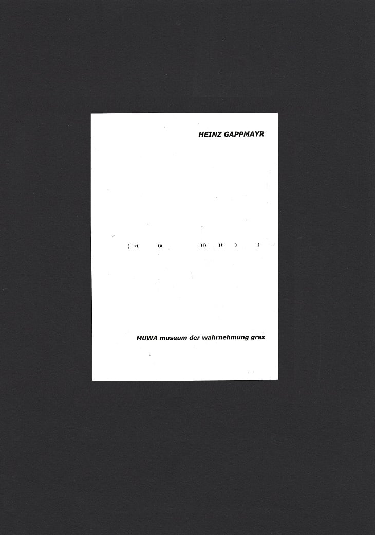 Die Begriffe selbst sind Kern des künstlerischen Konzepts. In dem Text zeit (Inkunabel/1966) ist das Wort zeit horizontal über die Bildfläche gedehnt. Es folgt der Leserichtung. Doch wird es mehrmals durch Klammerzeichen in beide Richtungen unterbrochen. Das Wort scheint sich durch die Klammern zu bewegen. Hier vereint Heinz Gappmayr zwei Bedeutungsebenen, einerseits das Wort zeit und zum anderen die Klammern, ein Interpunktionszeichen. Das Wort zeit bezieht sich auf keinen Gegenstand der Wahrnehmung. Es ist ein sinnlich wahrnehmbares Zeichen, das sich auf einen nicht anschaulichen Begriff bezieht. Die Klammern, die sich vom altgriechischen Wort parénthesis ableiten, das soviel wie Einschub oder inhaltliche Abgrenzung bedeutet, verändern die Funktionsweise des Wortes auf der Fläche. Durch die räumliche Durchdringung der einzelnen Buchstaben des Wortes entsteht ein weiterer, nicht-sprachlicher Bedeutungsraum. Durch die Dehnung werden gleichsam Schichtungen zeitlicher Abläufe, Zeiträume sichtbar. Wir erkennen, dass das Wort jenen umfassenden Begriff der Zeit impliziert, der sich analog zu den Bewegungen der Klammern als Zeitraum mit allem Vergangenen, Gegenwärtigen und Zukünftigen darstellt. Thema dieses Werkes ist die Komplexität und Vielschichtigkeit von Zeit, präsent hier mit minimalen Mitteln durch die Interferenz von Schrift und Zeichen.