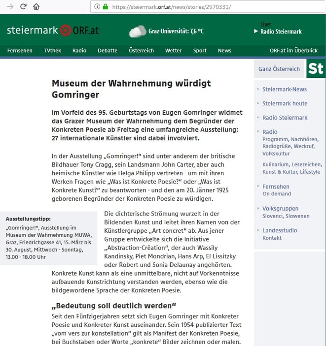Ausstellungsbericht GOMRINGER! / WEIHS von Kulturredakteurin BEATE WITTMANN, ORF STEIERMARK nachzusehen/-hören bis 11.4.2019 auf https://tvthek.orf.at/profile/Steiermark-heute/70020/Steiermark-heute/14009658