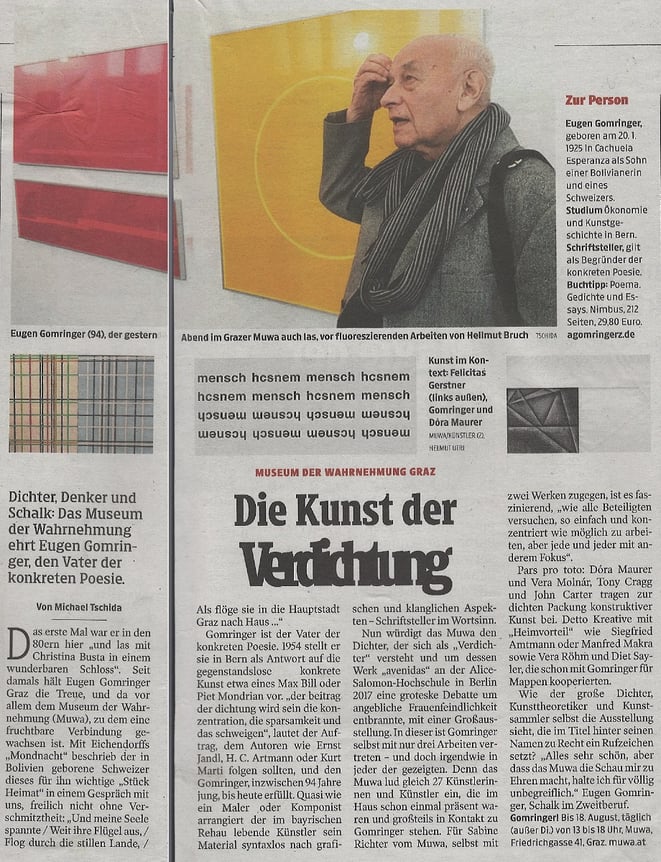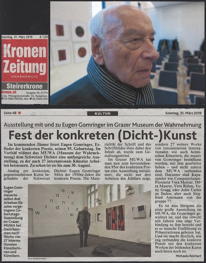 the MUWA. Just as the friendly contact between EUGEN GOMRINGER and the MUWA was developed since many years as he gave several opening speeches for exhibitions he is highly appreciated by the