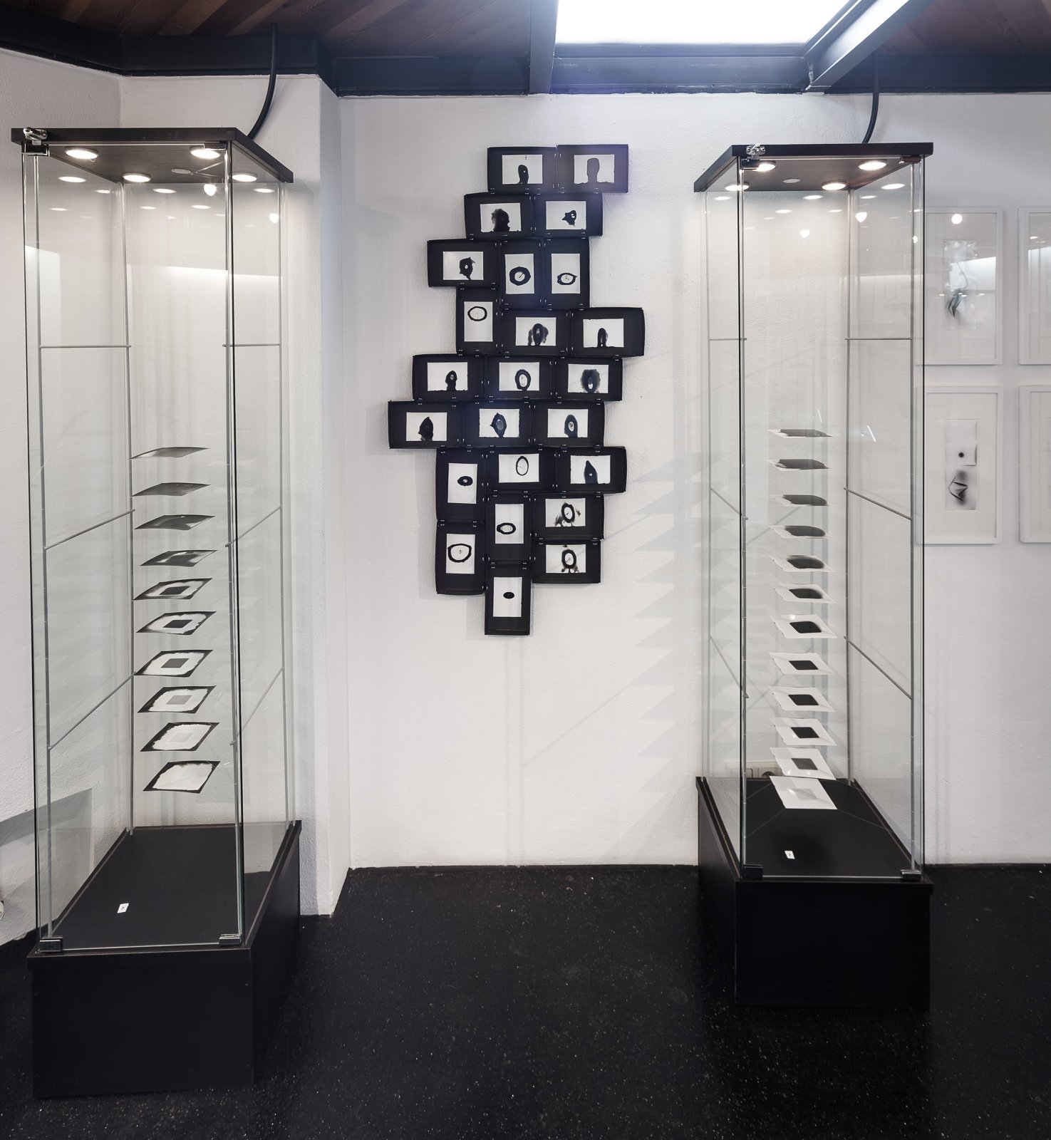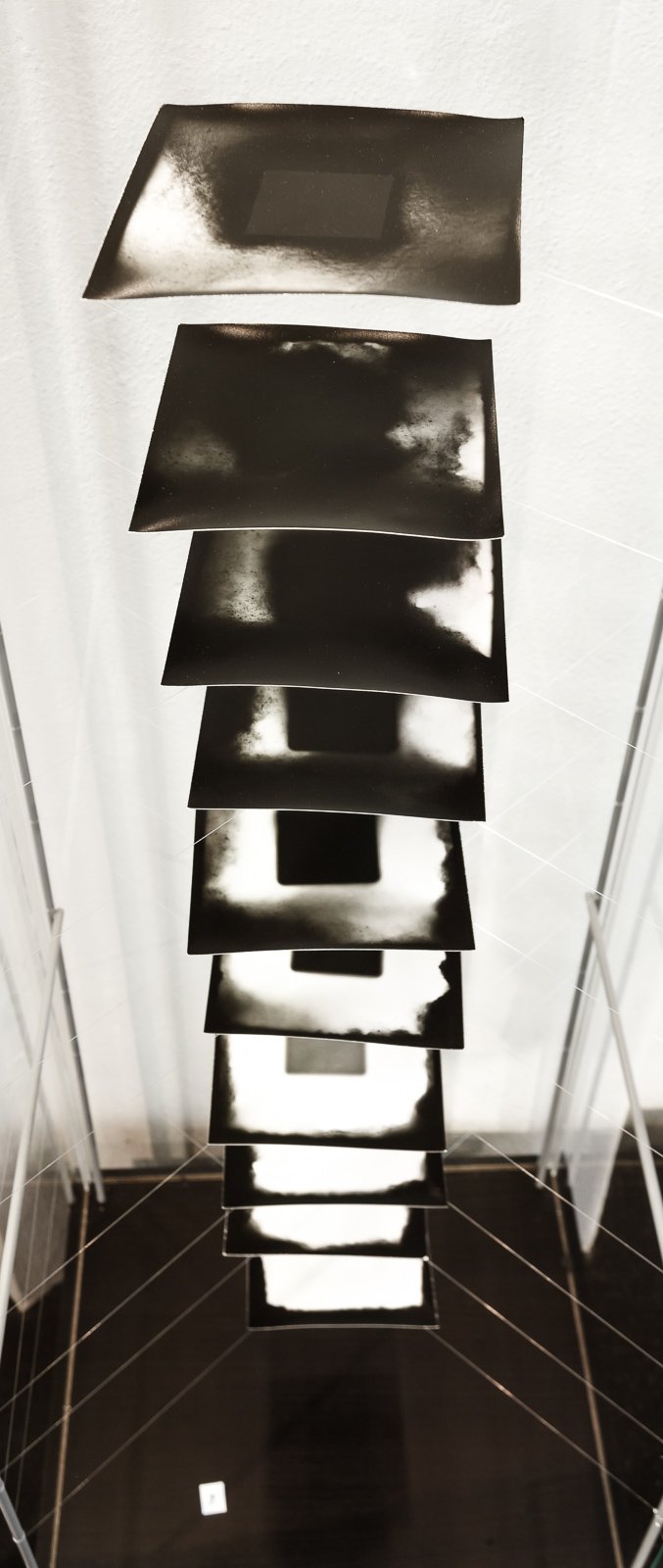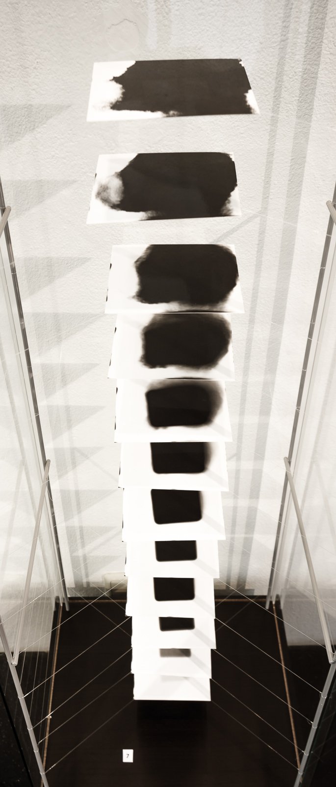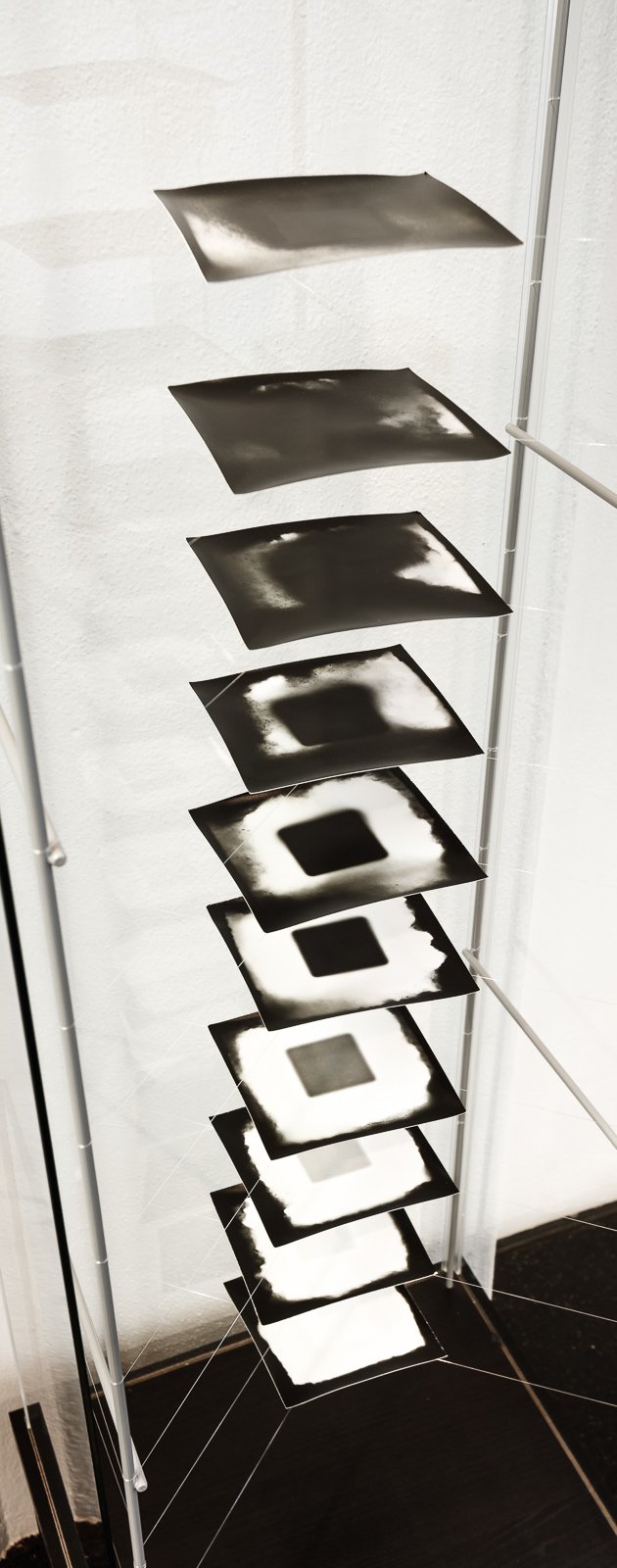 The famous quote of Gertrude Stein "a rose is a rose is a rose" expresses the multitude of layers in meaning behind a sign or image. It was a similar issue of identification of things that led Harald Mairböck to give the exhibition the title "a picture is a camera is a picture". This selection of works is based on experimenting with the original and direct relationship between light and surface. The artist uses just basic technological means; light, photographic paper and processing chemicals. Volume of image and projection space is an important feature as well. In volume.print the piled up paper layers unveil its materiality, in cubes and tubes the empty space is tested by building a pinhole camera using just photographic paper. In its extreme form, as in capillary.print series, the space between the image and the hole is so minimal that it can be defined as focal length zero. Its hole is not open to capture the image of objects outside but only pure light. The final image is highly dependent on chance during the whole process and takes an abstract shape, some kind of a dark stain on a white background. By being partly uncontrollable and because they don’t need camera nor any physical objects to depict these images show the most uncanny nature of photography. Experimenting with basic material: building simple paper cameras, piling up photographic paper sheets and then cutting holes and incisions, exposing them to bare light, playing with fluids, all this acts as artist’s contemplation on photography as medium and shows his interest in looking beyond the conventional horizons.