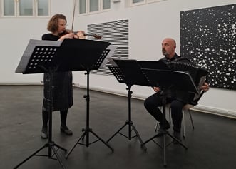 "Das Akkordeon ist ein verhältnismäßig junges Instrument. Seit seiner Erfindung im frühen 19. Jahrhundert sind viele Kompositionen entstanden, die auf unverwechselbare Weise den besonderen Klang des Akkordeons ausgeprägt haben. Auch heute übt dieses Instrument große Faszination auf Musikschaffende aus, mit seinen noch unentdeckten klanglichen Ausdrucksmöglichkeiten und der spezifischen Körperlichkeit des Akkordeonspiels. Die Violine scheint uns dagegen ganz und gar vertraut. Doch Komponisten und Komponistinnen des 20. und 21. Jahrhunderts, von Béla Bartók, über Helmut Lachenmann zu Enno Poppe, Clara Iannotta oder Rebecca Saunders, haben die Geige immer wieder neu entdeckt und ihre Spiel- und Ausdrucksmöglichkeiten erweitert: das Spiel mit ungehörten Harmonien, Farben und Geräuschen, erweitert ins Elektronische oder zurückgeworfen auf die eigene analoge Klangfülle des Instruments, die sich zwischen dem Spiel der Finger auf dem Steg und dem Bogen auf den Saiten Bahn bricht. Sophie Schafleitner und Krassimir Sterev haben Zeitgenoss°innen immer wieder zu neuen Werken für Violine und Akkordeon angeregt, was auch an diesem Abend mit vier aktuellen Stücken (sie wurden 2023 beim Festival Klangspuren uraufgeführt) für dieses ungewöhnliche Duo zum Ausdruck kommt. Schon im Dezember 2023 war ein Konzert mit dem Duo bei „open music“ geplant, das leider krankheitsbedingt abgesagt werden musste. Wir freuen uns, dass es hiermit zeitnah nachgeholt werden kann.