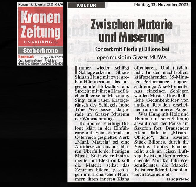 „open music“ widmet Pierluigi Billone (1960 in Italien geboren, lebt er nach Studien bei Salvatore Sciarrino und Helmut Lachenmann seit vielen Jahren in Wien) einen Abend, an dem mit zwei seiner aktuellsten, jeweils rund halbstündigen Solostücken das Instrumentarium grundlegend erforscht und ausgelotet, in tiefere Klangsphären eingetaucht und dabei gleichfalls formale Stringenz entwickelt wird. Als Instrumentarium dient dem Komponisten dabei im Fall von Mani. Materia etwa ein einfaches Holzstück. Gerahmt werden Billones Solitäre durch ebenso elementare Improvisationen. Für die Exzellenz der Aufführung garantieren Shiau-Shiuan Hung und Salim Javaid vom Kölner Trio Abstrakt, die die Stücke mit dem Komponisten in intensivem Austausch erarbeitet und auch uraufgeführt haben.