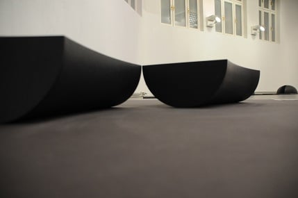Exactly calculated circle forms constitute the basis of the sculptures, split by curved or linear cuts. “Sculpture is balanced tension”. The shapes of WOLFGANG RITTER develop dynamics whether in a mono-sculpture or in dialogue within a segmented work through targeted positioning of singular parts via turning, flapping, dividing, repeating or ranking in juxtaposition and finally also in the context of the arrangement of the exhibition here in the Museum of Perception. The dynamic element is to be continued in the contemplation of the works whose rising and for this reason also whose super elevation is not at all pursued by the artist. On the same level as the sculptural works on the floor observing visitors move and change constantly their position and their relation to the sculptures.