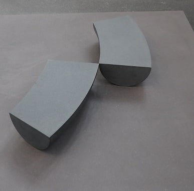 EF: Wenden wir uns dem plastischen Geschehen, deinen Formen zu. Bereits in deinen frühen, beispielsweise den polygonalen Arbeiten, gibt es oftmals den Dialog von zwei Formen innerhalb einer Arbeit, dieses „Kommunizieren“ zieht sich in vielen Arbeiten bis heute durch. Deine Formen, wie etwa Kugel- oder Ellipsen-Formen/Variationen mit Schnitten, sind nach genauen mathematischen Richtlinien herausgearbeitet und positioniert. Innerhalb deiner mehrteiligen Arbeiten geht es um ein Zusammenfügen, ein neu Ordnen durch Gegenüberstellen, durch paralleles Positionieren, etc. Wie gehst du da vor, beispielsweise in der Arbeit 2, ohne Titel 6/2017, Dolerit, 120x40x22 cm?