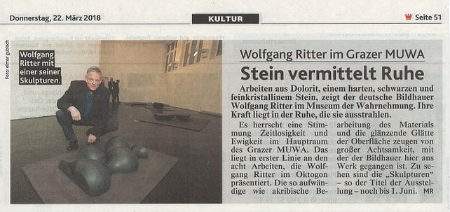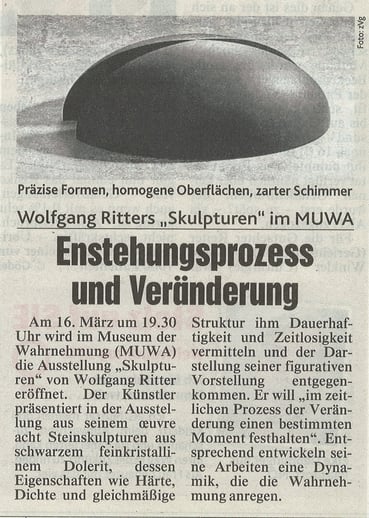 „Im zeitlichen Prozess der Veränderung einen bestimmten Moment festhalten“. WOLFGANG RITTER fokussiert im Hinblick auf sein künstlerisches Schaffen als Steinbildhauer den von großer Achtsamkeit und Aufmerksamkeit geprägten Entstehungsprozess seiner Skulpturen und einen nicht genau einschätzbaren Zeitpunkt der Formwerdung.