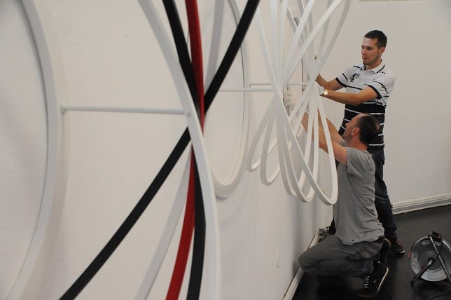 Der Künstler setzt seine Ideen in unterschiedlichen Materialien um, darunter Papier, Pappe, MDF oder Stahl, operiert mit verschiedenen Oberflächen-Qualitäten, nutzt klassisches Werkzeug ebenso wie mittlerweile den Computer, um ein zweidimensionales Objekt in einen rotierenden Körper zu transformieren, diesen auszutesten. In der Ausstellung "EINEN KREIS DENKEN" im Museum der Wahrnehmung MUWA zeigt der Künstler Werke aus unterschiedlichen Schaffensphasen.