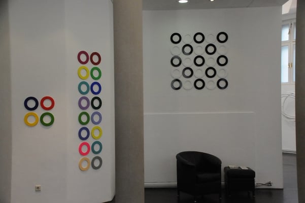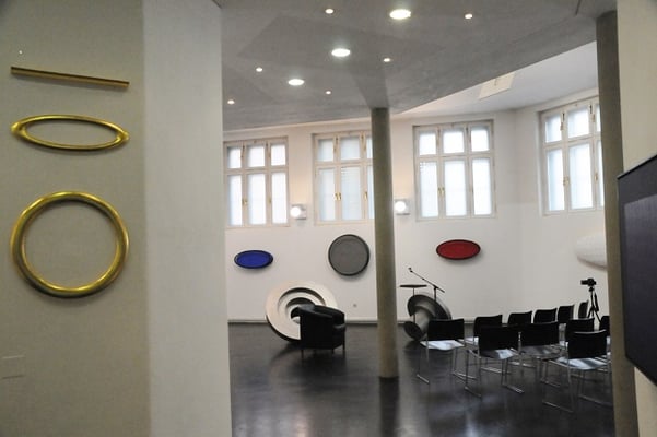 If one takes a chance on ROY's thought experiment, so the octagon of the Museum of Perception is a possible departure point for the circle - even when through endless cutting of the corners of the octagon, you'll never completely reach it. Visitors can really walk in a circuit through the exhibition due to the architecture, complemented by the perceiving walk around the objects. All ends in the invitation to interact in the game of compilation: A square of 4 x 4, thus 16 rings of different colours illustrates that 663.457 years would be necessary to show all possibilities providing that the structure is changed every second!