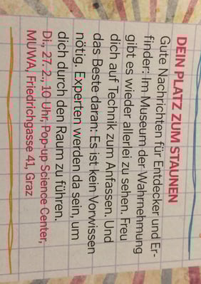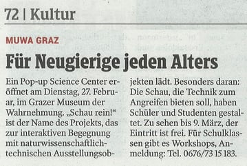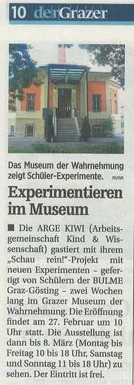 Von 27. Februar bis 8. März 2018 gastiert die ARGE KIWI mit ihrem "Schau rein!"-Projekt mit neuen Experimenten zwei Wochen lang im MUWA!