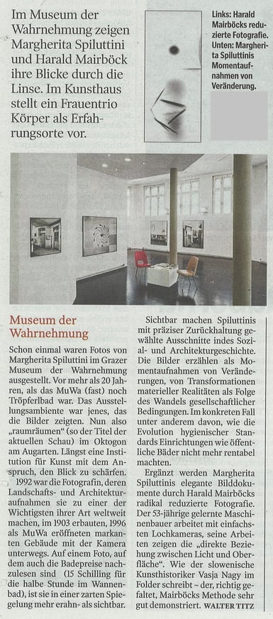 Die international bekannte Architekturfotografin MARGHERITA SPILUTTINI hat insgesamt vier Foto-Serien des oktogonalen Gebäudes Friedrichgasse 41 angefertigt, drei davon vor dem Umbau des Tröpferlbades zum Museum der Wahrnehmung MUWA (1995). Ausgewählte Fotografien der ersten Serien wurden in der Ausstellung AUGENBAD im Rahmen des Festivals steirischer herbst 1994 vor Ort gezeigt. Anlässlich des heurigen Jubiläums "20 Jahre MUWA in der Friedrichgasse 41" hat MARGHERITA SPILUTTINI erneut eine Auswahl von Fotografien in zwei Formaten (50 x 60 cm, 120 x 150 cm) für die Ausstellung "raumräumen" zusammengestellt.