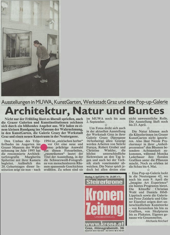Ausstellungsbericht von MICHAELA REICHART in der Kronenzeitung vom 4. April 2016