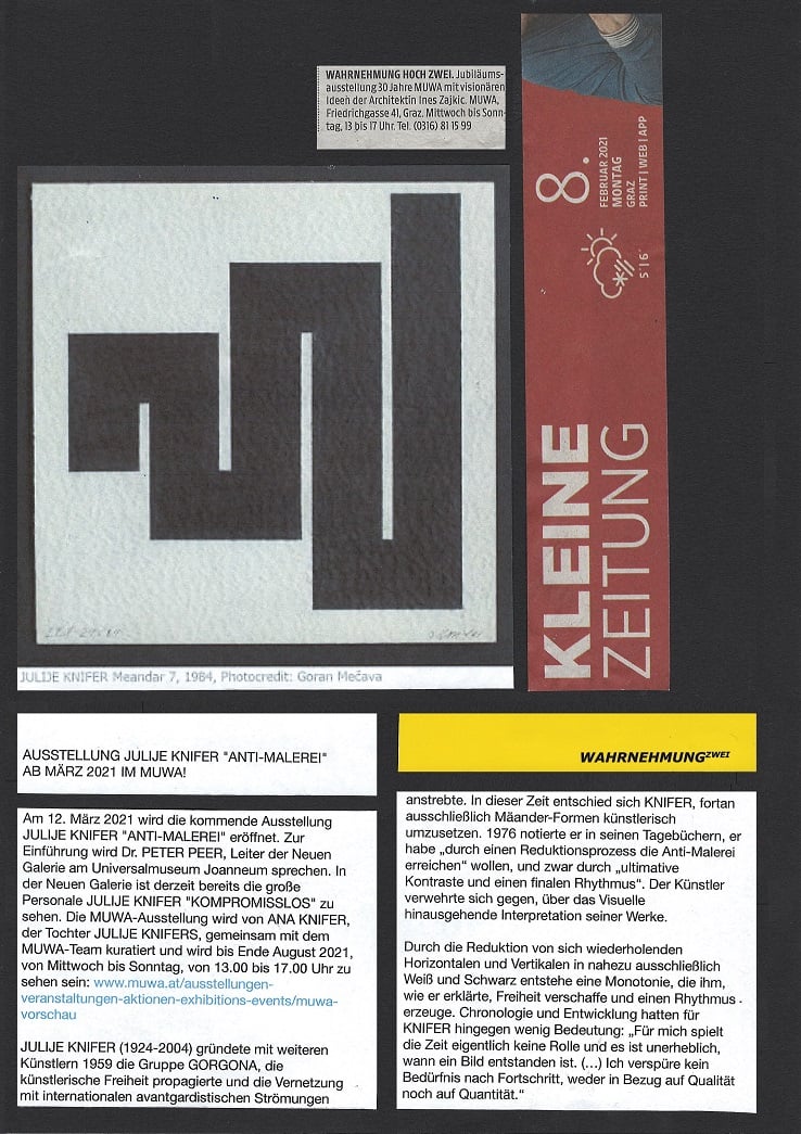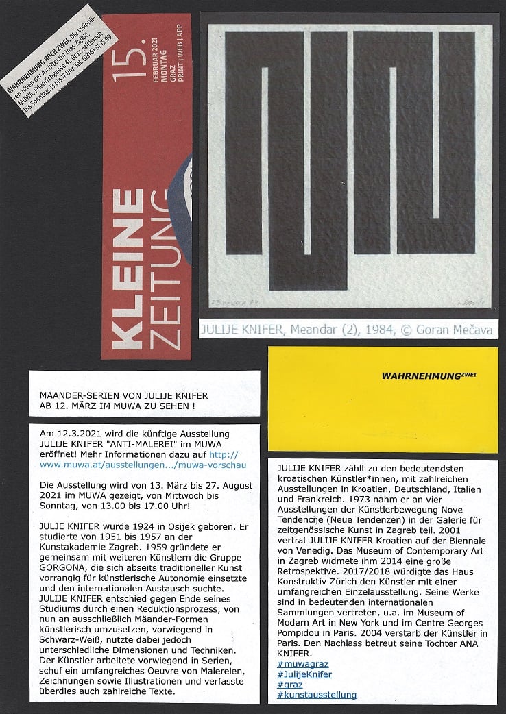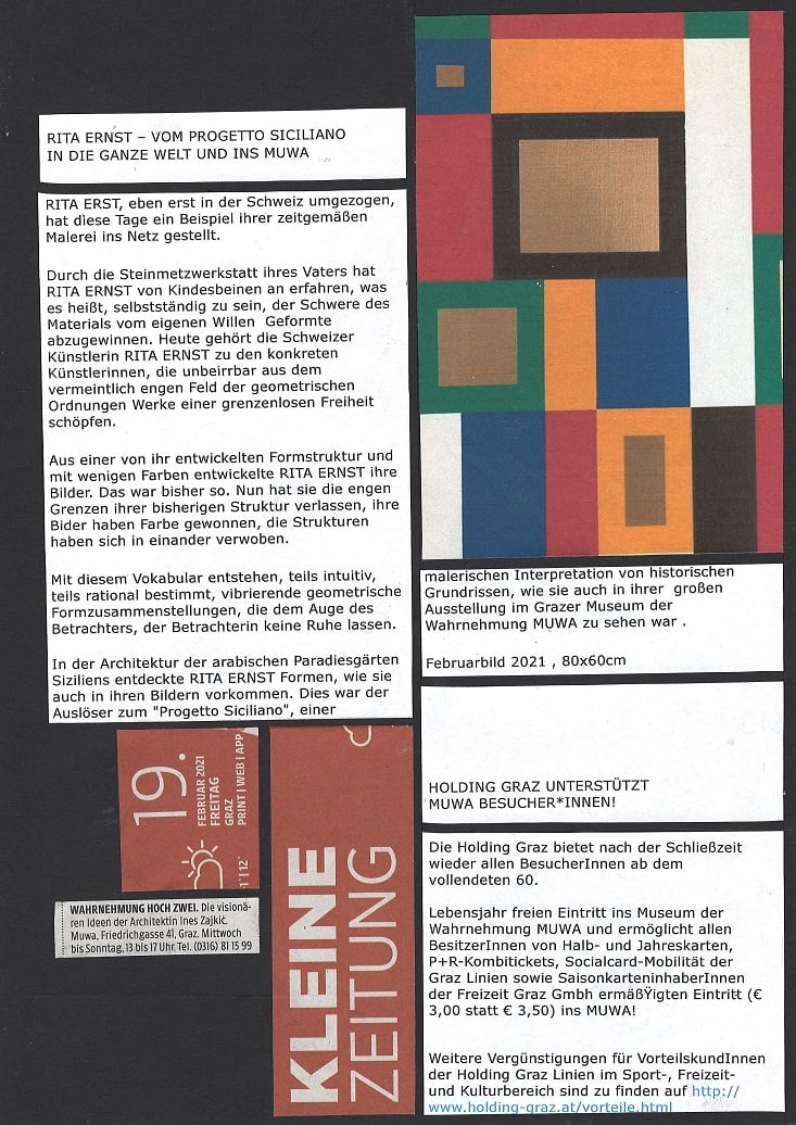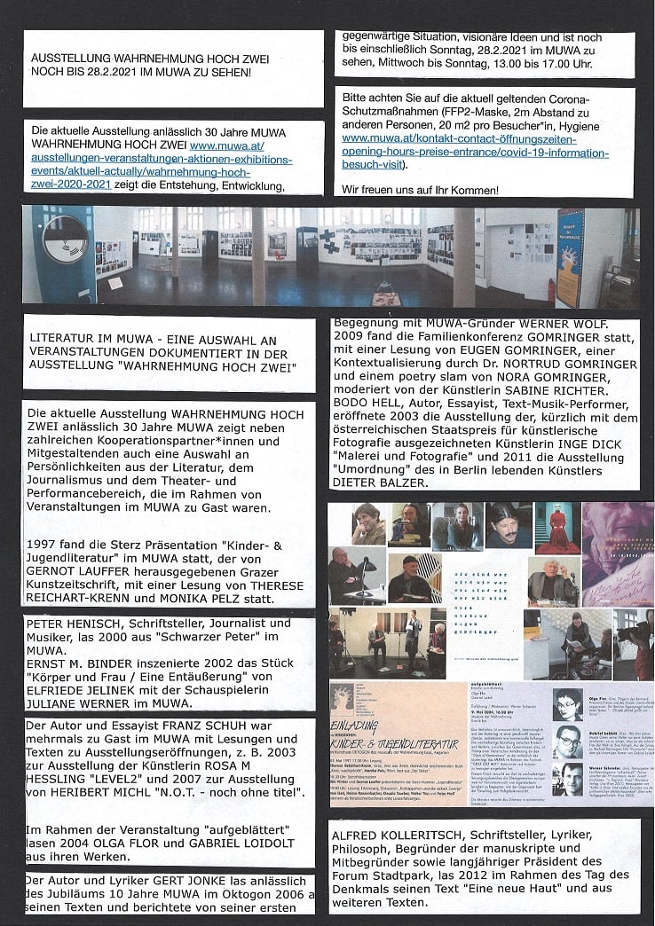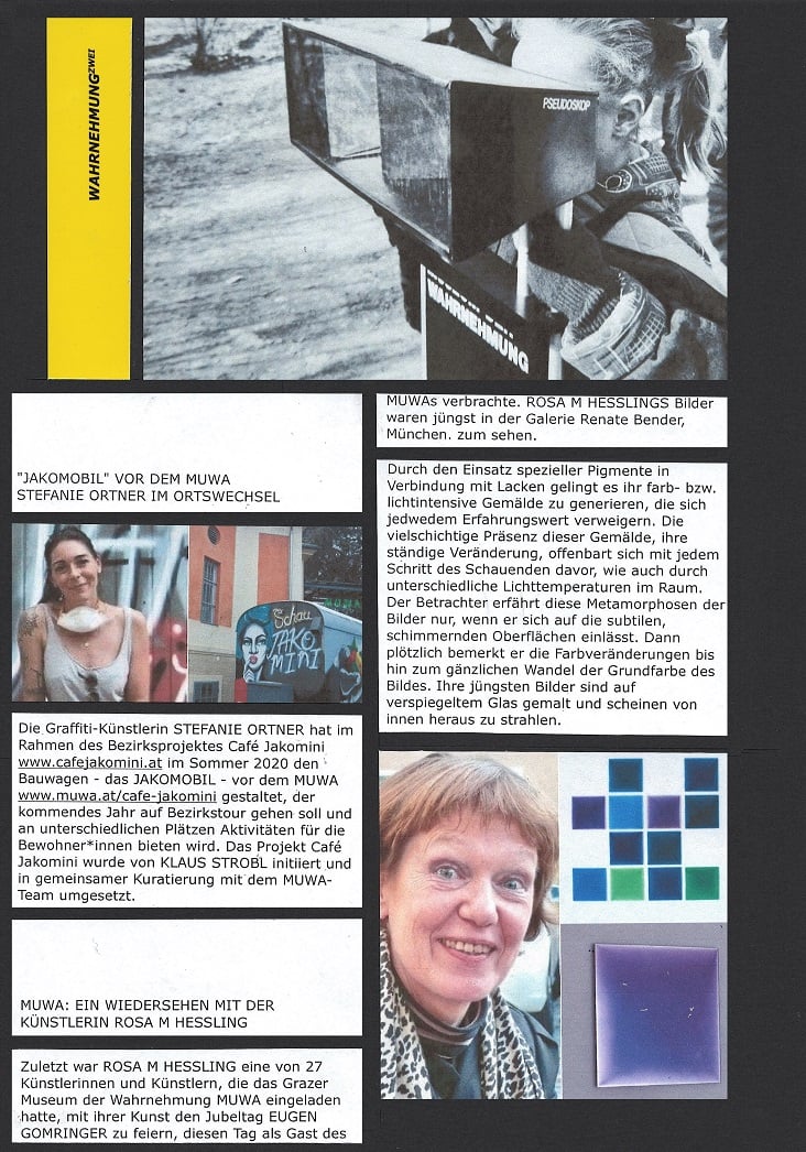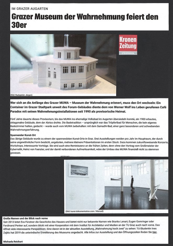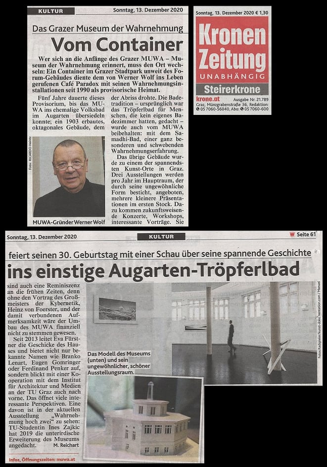 MICHAELA REICHART, Leiterin der Kulturredaktion der Kronenzeitung, berichtet in der Ausgabe vom 13.12.2020 und auf der Website der Kronenzeitung über das MUWA-Jubiläum und die Ausstellung WAHRNEHMUNG HOCH ZWEI !