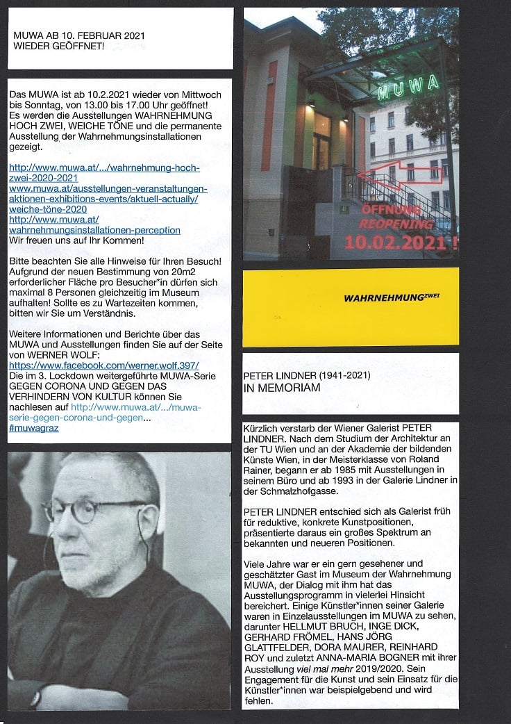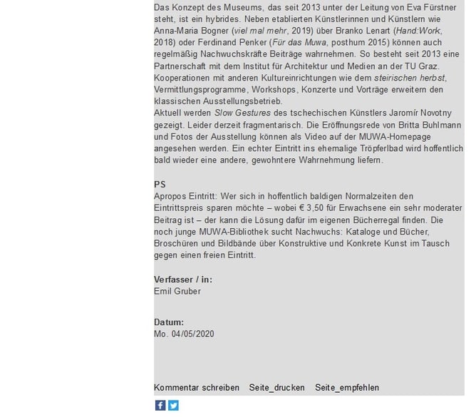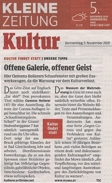 In der Kleinen Zeitung vom 5.11.2020 verweist die Kulturredaktion auf die Ausstellung im MUWA und die neue muwa-Serie GEGEN CORONA UND GEGEN DAS VERHINDERN VON KULTUR!