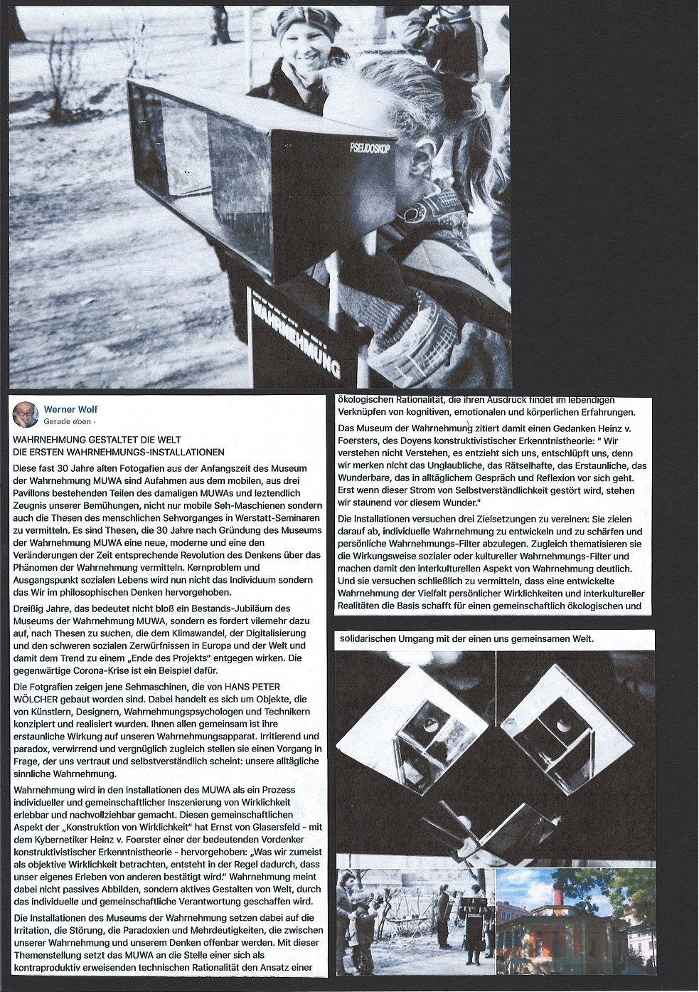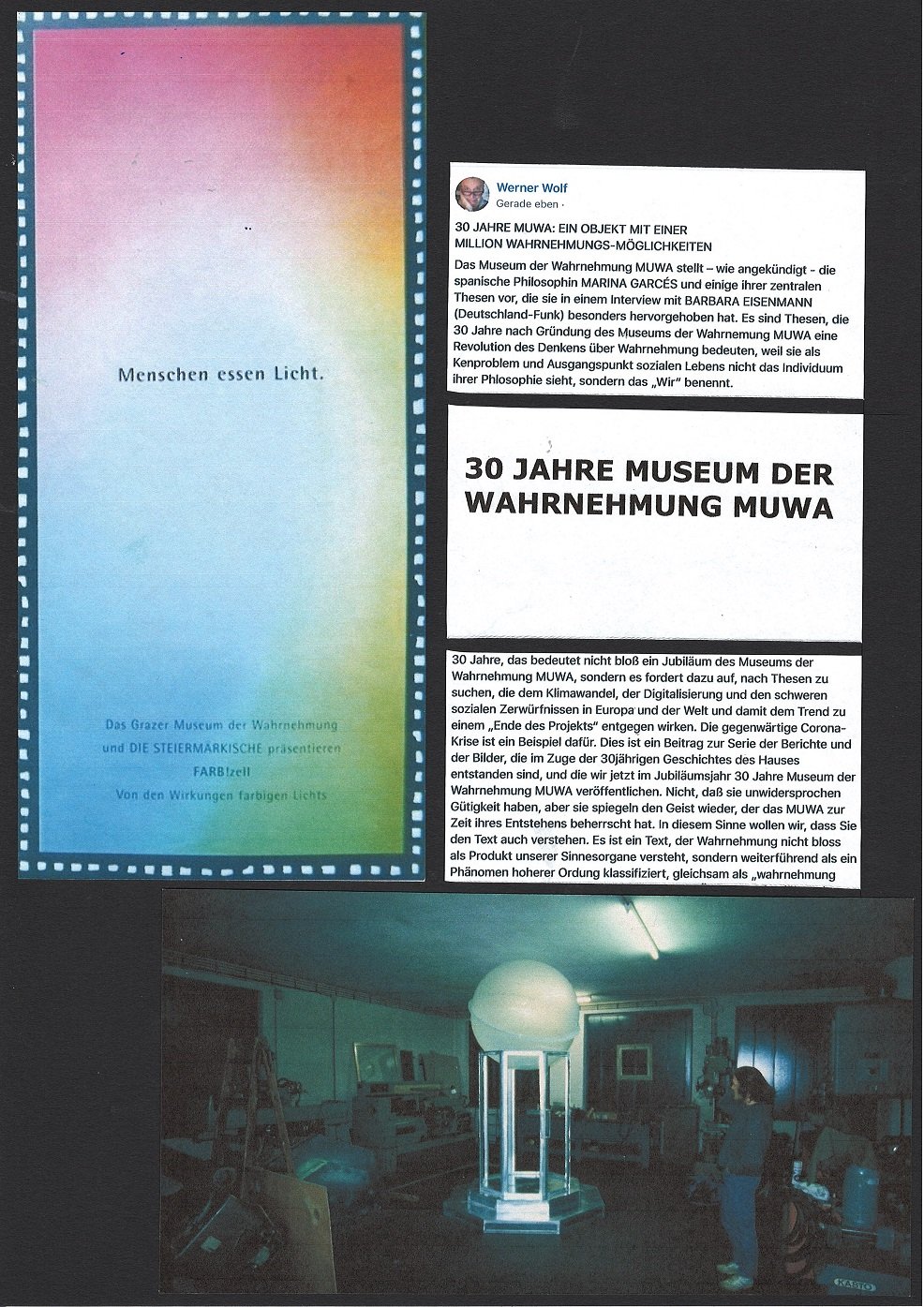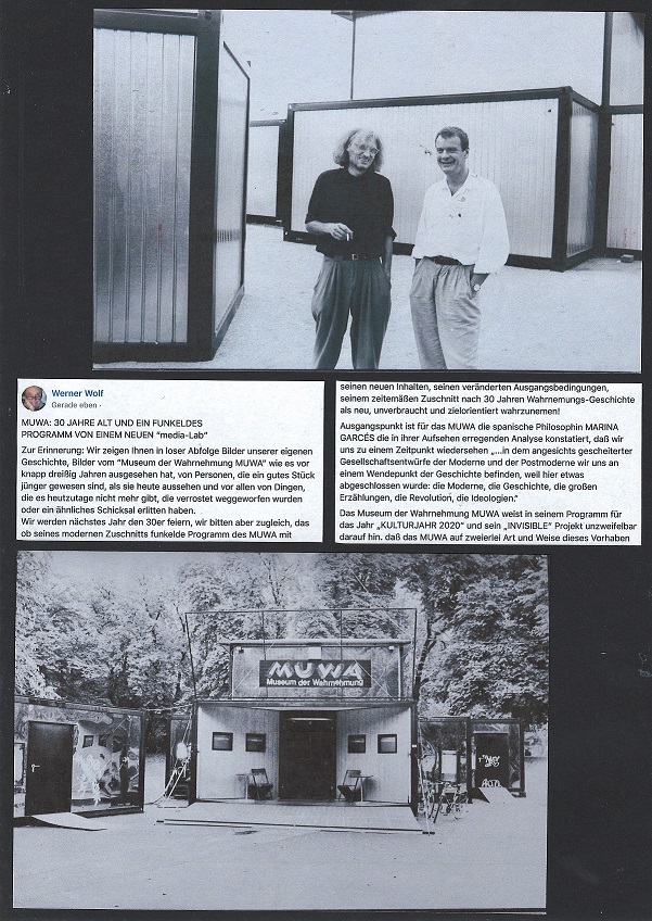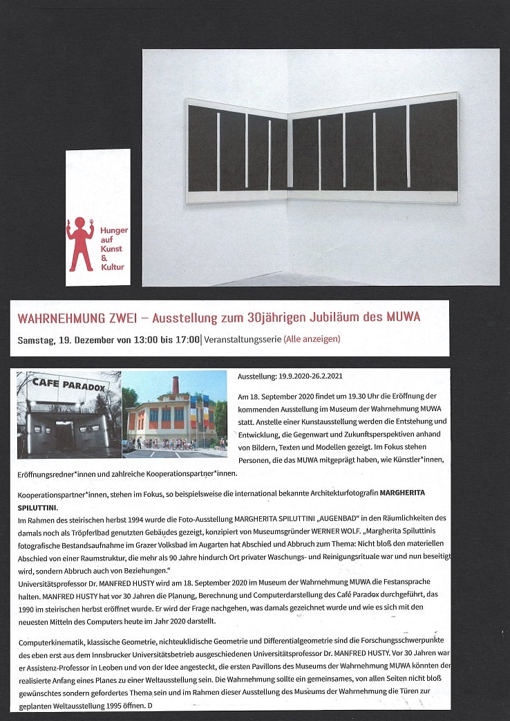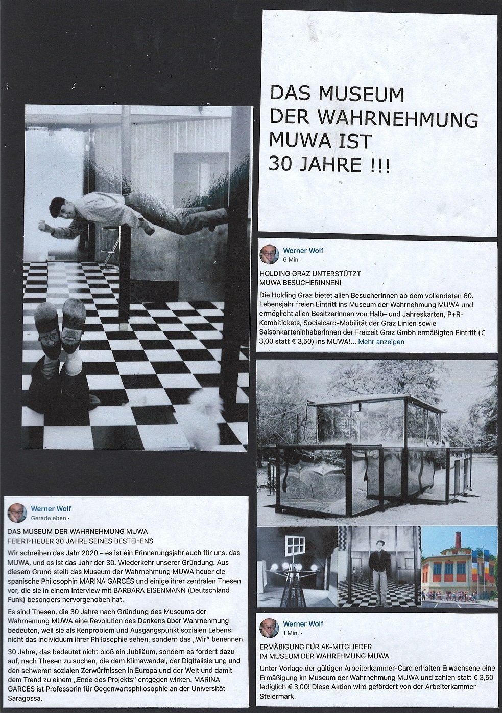 WERNER WOLF gründet 1990 das Museum der Wahrnehmung MUWA, das in einer, vom Innsbrucker Architekten HELMUT REITTER entworfenen Container-Architektur, dem Café Paradox, im Grazer Stadtpark untergebracht war. Universitätsprofessor Dr. MANFRED HUSTY führte vor 30 Jahren die Planung, Berechnung und Computerdarstellung des Café Paradox, das im Inneren den damals weltgrößten Ames-Raum darstellte, durch. Die Eröffnung 1990 erfolgt im Rahmen des steirischen herbst.