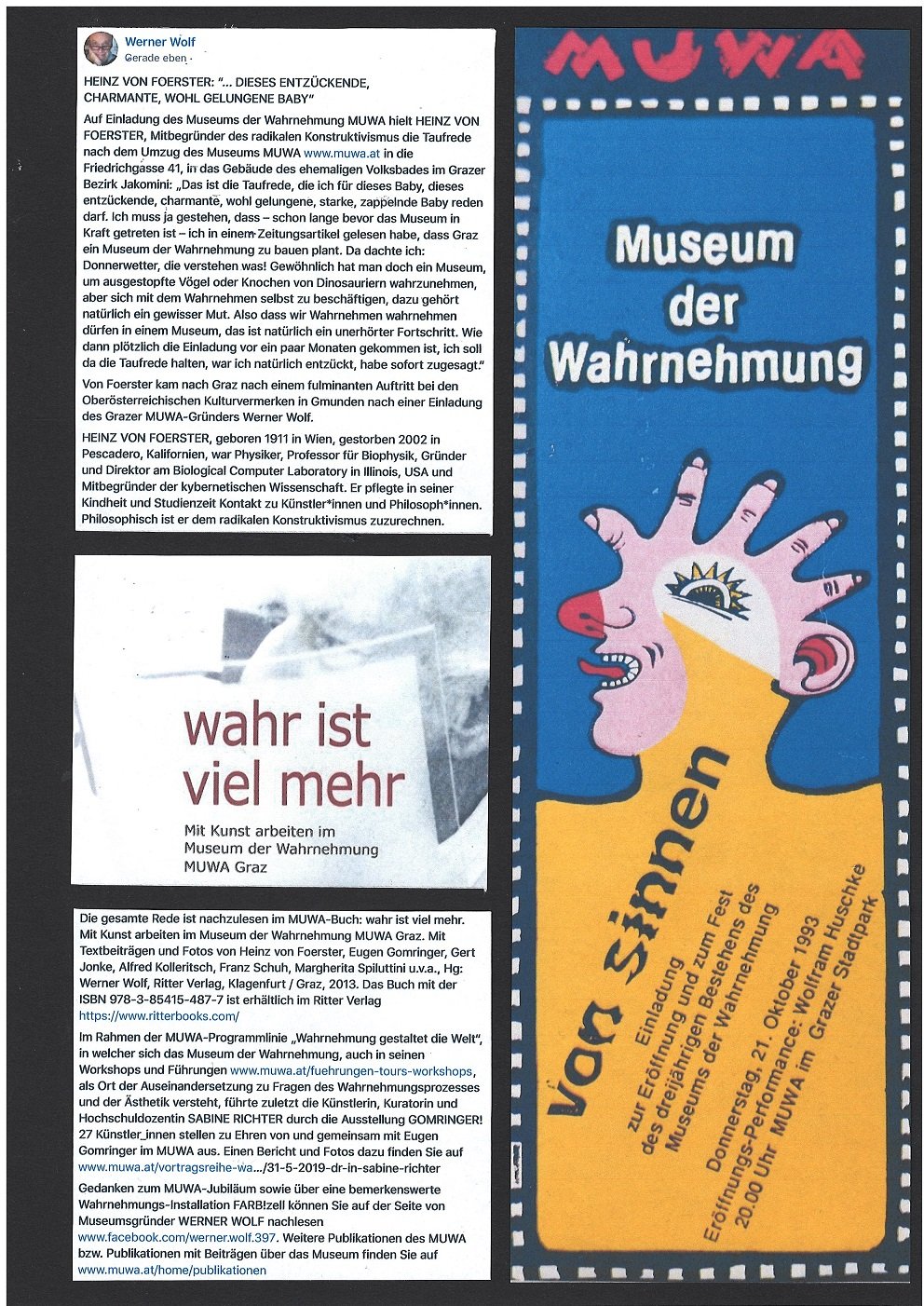 Die Ausstellung WAHRNEHMUNG HOCH ZWEI unterstreicht die Forderung erneut, die Wahrnehmung zum Thema zu machen – auch im Sinne des Biophysikers und Kybernetikers HEINZ VON FOERSTER, der begeistert von der Idee, ein Museum der Wahrnehmung zu gründen, umgehend zusagte, die Eröffnungsrede 1996 zu halten, nach dem Umzug des MUWA ins Oktogon des ehemaligen Volksbades in der Friedrichgasse 41.