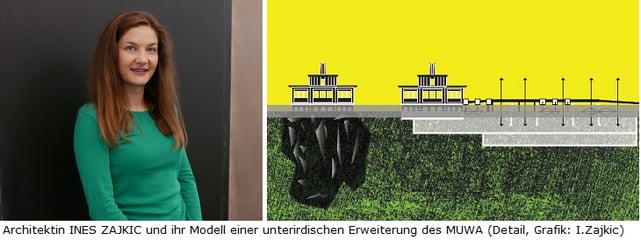 Die Jubiläumsausstellung WAHRNEHMUNG HOCH ZWEI widmet auch visionären Ideen Raum. Die Architektin INES ZAJKIC entwickelte 2019 im Rahmen ihrer Diplomarbeit, betreut von Assoc. Prof.in Dr.in MILENA STAVRIC am Institut für Architektur und Medien an der Technischen Universität Graz, ein Konzept für eine mehrstufige, unterirdische Erweiterung des MUWA im Augarten. Ihr Konzept und Modell werden in der Ausstellung präsentiert.