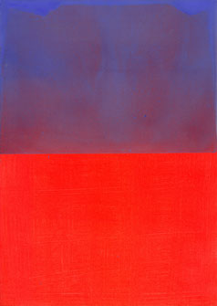 For the ‘Duochrome‘ series, which he began in 2009, he divides each work into two colour fields of equal size, separated by a horizontal centre line. After applying the monochrome colour over the entire sheet, the second, diluted colour is poured over one half, starting from the centre line, and distributed by carefully moving the sheet. This physical process requires concentration and quick work. This specific, not entirely controllable application of colour creates both dense and more translucent areas - results that repeatedly offer the artist unexpected outcomes.