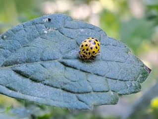 Parallel zu einer Vielzahl an Pflanzen und Kräutern sind zahlreiche Tiere in den Hochbeeten zu finden, so zum Beispiel der Zweiundzwanzigpunkt-Marienkäfer oder Pilz-Marienkäfer (Psyllobora vigintiduopunctata), ein Käfer aus der Familie der Marienkäfer (Coccinellidae). Die Käfer werden drei bis 4,5 Millimeter lang und haben einen fast kreisrunden Körper. Ihre Deckflügel sind kräftig gelb gefärbt und weisen je elf schwarze Punkte auf. Auch das Schildchen (Scutellum) ist schwarz. Auf dem ebenfalls gelben, manchmal aber auch hellen Halsschild befinden sich fünf symmetrisch angeordnete, schwarze Flecken, einer davon direkt am Schildchen. Die erwachsenen Tiere ernähren sich von Echtem Mehltau. Wegen ihrer Pilznahrung gelten sie bei Gärtner:innen als Nützlinge. Bei Gefahr zieht der Käfer die Beine an seinen Körper und stellt sich tot. Aus seinen Beinen sondert er dabei ein übelriechendes Wehrsekret ab (Reflexbluten). Im Frühling legen die Weibchen die Eier auf von Mehltau befallene Blätter. (Informationen: Wikipedia)