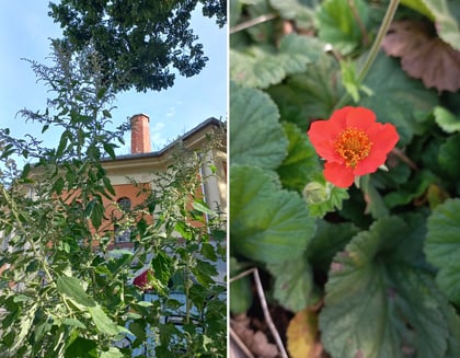 In den Hochbeeten gedeihen nach wie vor einige Kräuter, Pfefferminze oder Zitronenmelisse, und einige Blumen zeigen noch zahlreiche Blüten wie die Rote Nelkenwurz (Geum coccineum). Die gegenüber Schädlingen sehr robuste Blume benötigt volle Sonne und erreicht Wuchshöhen von 15 bis 30 cm.
