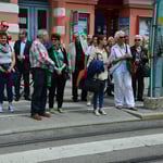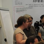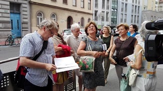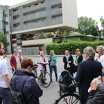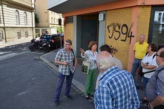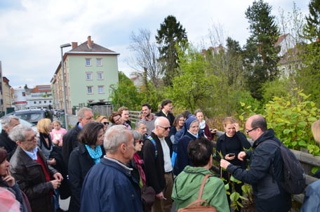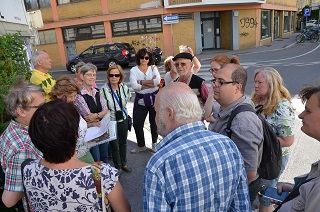 Anschließend ging es weiter zum SMZ Stadtteilzentrum Jakomini (http://smz.at/stadtteilzentren-grunanger-und-schonausiedlung_4209.phtml), dessen Aktivitäten von STZ-Leiterin Martina Frei vorgestellt wurden. Direktorin Angela Kaltenböck-Luef von der Volksschule Schönau (http://vs-schoenau.info/) brachte die von SchülerInnen angefertigten Plakate vom ZeitzeugInnen-Dialog einiger Klassen mit und berichtete vom intensiven Austausch der SchülerInnen mit älteren BewohnerInnen des Bezirks. Anschließend rollte Martina Frei beim Rundgang durch weitere Viertel des Bezirks Jakomini gemeinsam mit Angela Kaltenböck-Luef Historisches auf, vielerorts diskutierten die TeilnehmerInnen über Veränderungen im Stadtbild des Bezirks.