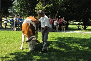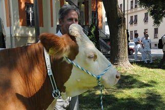 In der Zeit von 11:00 - 14:00 Uhr brachte der Semriacher Bergbauer Anton MÖSTL eine seiner Kühe in den Augarten vor das MUWA und informierte die SchülerInnen der Medien HAK Graz