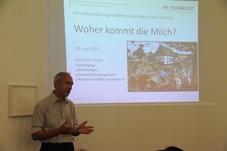 Nach der Begrüßung zur abendlichen Themendiskursveranstaltung lieferte DI Johannes HAAS, Studiengangsleiter "Nachhaltiges Lebensmittelmanagement" an der Fachhochschule Joanneum, im Rahmen seiner Präsentation Informationen zum aktuellen Stand und warf Fragen auf.