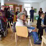Um 12.15 Uhr war Station im Messequartier (http://lebenshilfen-sd.at/wohnen/trainingswohnen/wohnverbund_messequartier), wo Mark Staskiewicz, Leiter des Wohnverbundes Messequartier eine Auswahl an Projekten, Veranstaltungen und Festen von Inklusions- und Nachbarschaftsarbeit präsentierte, und zwar im InCafé, das von Leiterin Veronika E. Candussi ebenso vorgestellt wurde. Dank der Buffet-Spende von Gemeinderat Markus Schimautz konnten sich alle TeilnehmerInnen stärken und besuchten noch den Raum der Nachbarschaft für eigene Reparaturen und die erst kürzlich fertiggestellten, selbst gebauten Hochbeete.