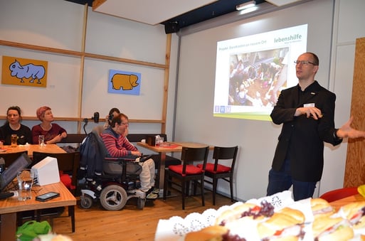 Mark Staskiewicz ist Leiter des Wohnverbundes Messequartier - Lebenshilfe Soziale Dienste GmbH (www.lebenshilfe-sd.at) und Obmann der Interessensgemeinschaft Wohnanlage Messequartier (http://www.messequartier.info) und stellte das Messequartier vor und präsentierte anhand von zahlreichen Bildern die Aktivitäten im Rahmen des Zusammenlebens von unterschiedlichen Generationen im Messequartier.