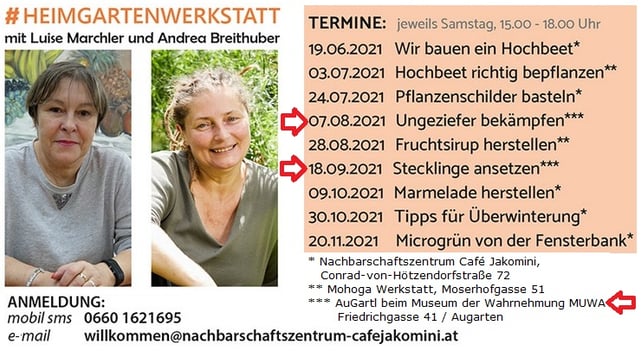 Zwei Termine - 7. August "Ungeziefer bekämpfen" und 18. September "Stecklinge ansetzen" - finden direkt bei den AuGartln-Hochbeeten vor dem MUWA statt!