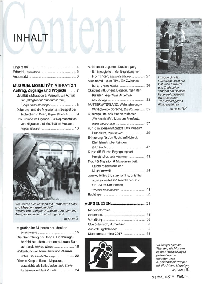Die Stellwand - Österreichische Zeitschift für Museen und Sammlungen von MUSIS - Museen und Sammlungen in der Steiermark, 2/2016 widmet sich in ihrer aktuellen Ausgabe umfassend dem Thema Museum, Mobilität & Migration. Über den Workshop MUTTERVATERLAND berichtet Eva Fürstner, Leiterin des Museums der Wahrnehmung MUWA (siehe weiter unten).
