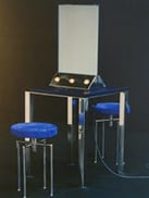 eyes meet on the mirror image. If you now direct the light of the adjustable lamps on different parts of your faces, ajusting the brightness with the dimmer, you can blend parts of your face with